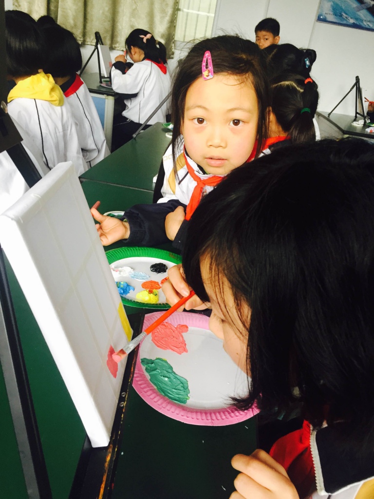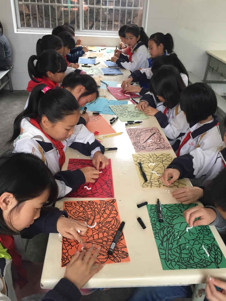 物质帮助对于孩子们而言,还是其次。更重要的是为他们带来心灵的陪伴和真情的感染。为此,杭师大的大学生志愿者们分为三个小组,绘画组、泥塑组和体育组,分别开始带领小朋友们开展一堂别开生面的活动课。在国芯小学,绘画组的学生在老师的教导下,画起了桑叶,一开始学生们因为不自信而不敢动手直接用马克笔在卡纸上直接作画,在志愿者的耐心指引下,慢慢地大家都找到的作画的感觉,一个接一个开心地跑来向志愿者老师展示自己手中的画。最后学生们用陶泥捏成蚕宝宝的样子,放在桑叶画上。看着栩栩如生的作品,大家都露出了欣慰的笑容。而陶泥组的学生,用手中的太空黏土施展着自己天马行空的想象力。由于下雨,体育组的学生们在教室里踢起了足球,待到天空放晴,志愿者老师带着学生们一起投篮,感受体育运动带来的魅力。