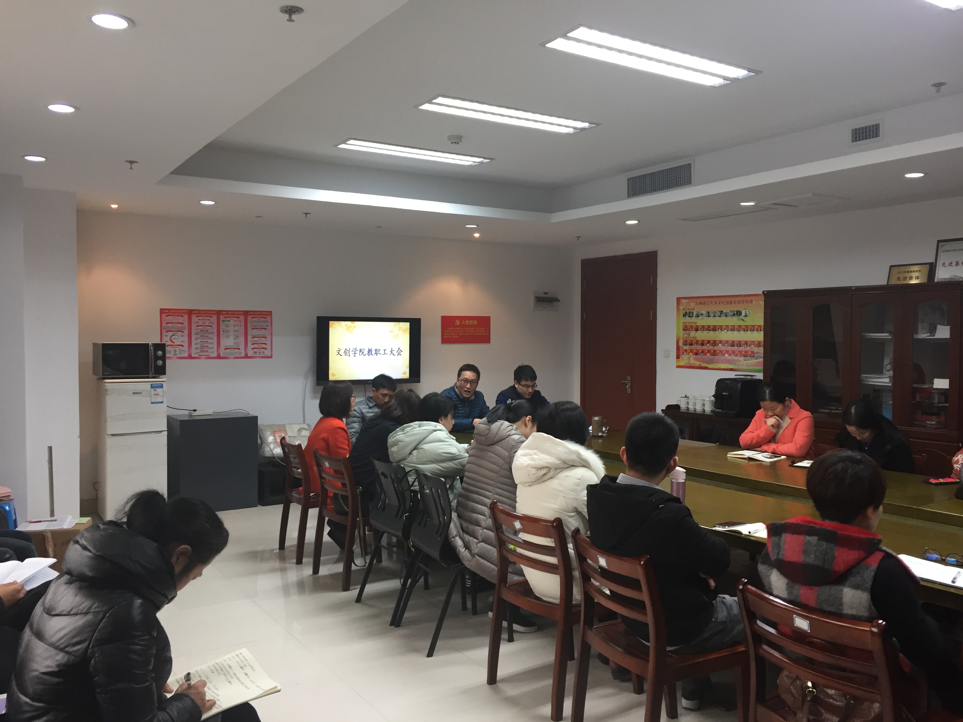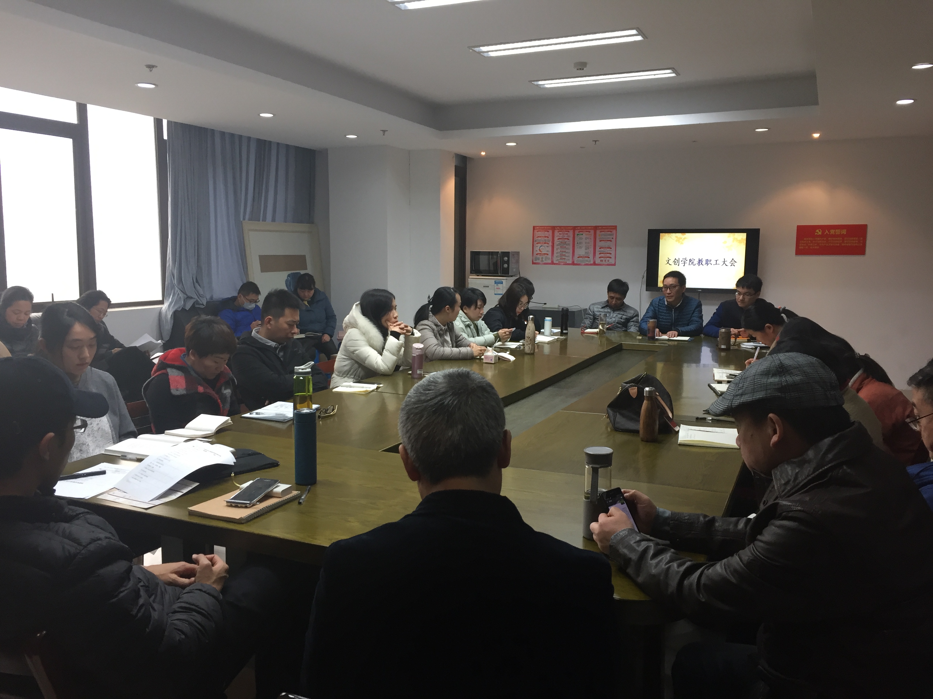 2月17日上午文创学院开展全体教职工大会,结合学校新一轮的人事制度改革中岗位设置聘任办法和绩效工资实施办法布置新学期工作。