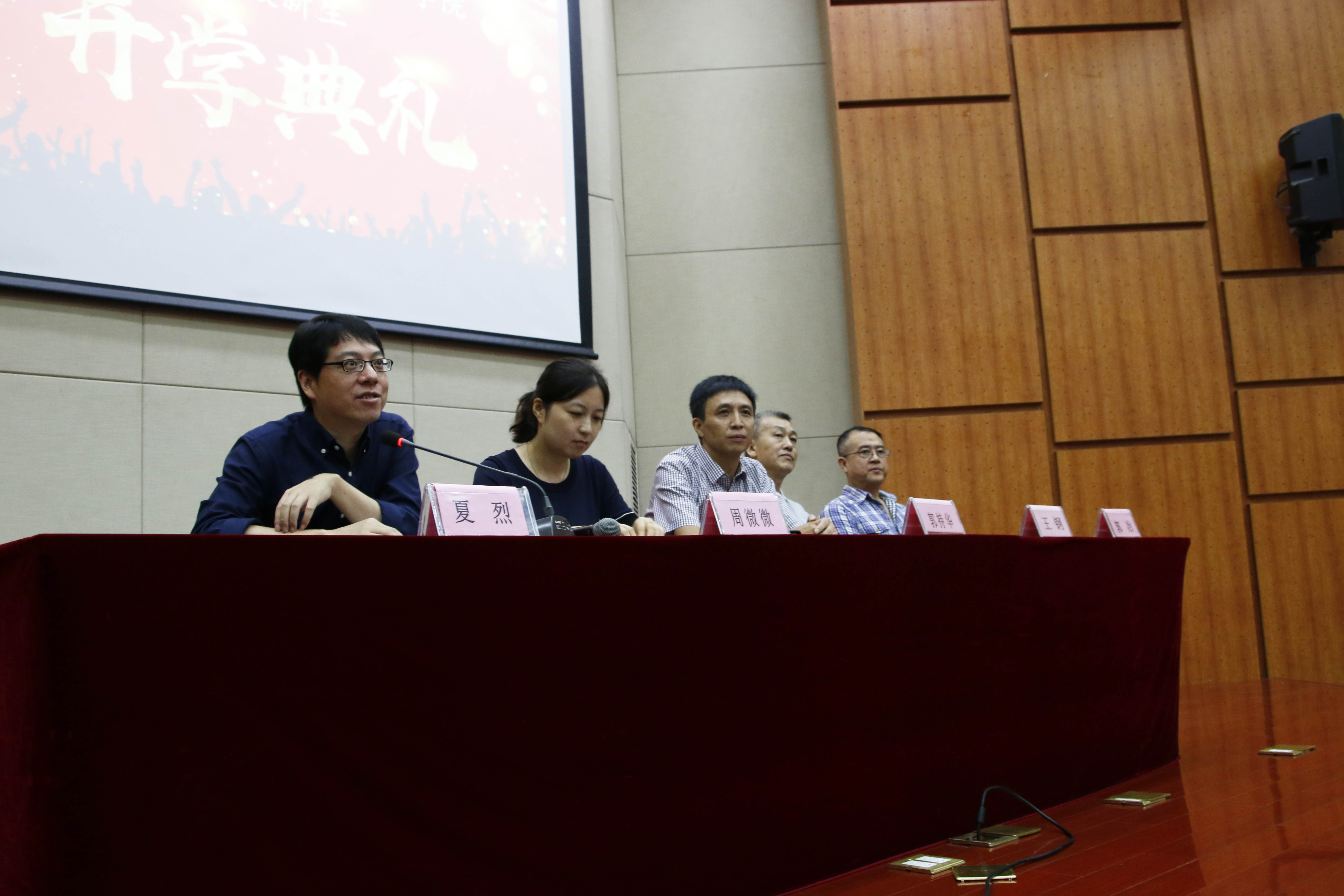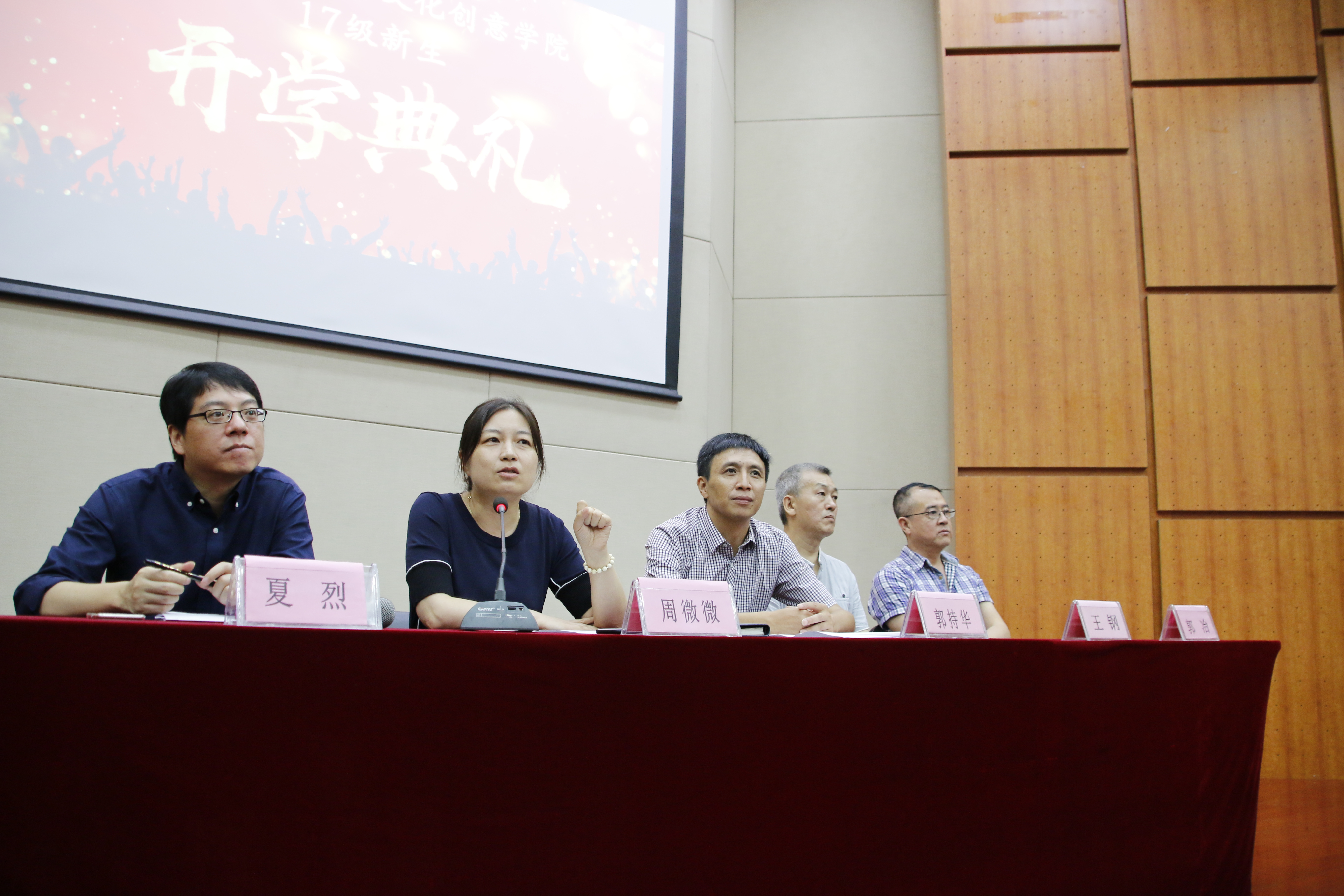 教师代表夏烈老师随后发言,他表示新入学的大学生首先要找到自己的定位,在这个年龄阶段做自己喜欢的事、做正确的事、做美好的事,要有超越加克服的力量。希望同学们在文化创意学院四年的生活中有创新、敢担当,多向老师交流和请教问题,争取做一名有文化、具有科研探索的优秀青年。