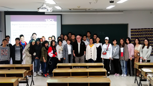 “数字人文是一门跨学科的学业”Simon 教授这样跟我们解释,跨界跨文化合作在这里并不是什么稀奇事。Simon教授的风趣和承担翻译工作的孔老师的活泼带给同学们一场趣味横生的学习经历,讲座过后Simon教授还和大家一起开心的合影留念,双方将进一步探讨学术与教学方面的合作。