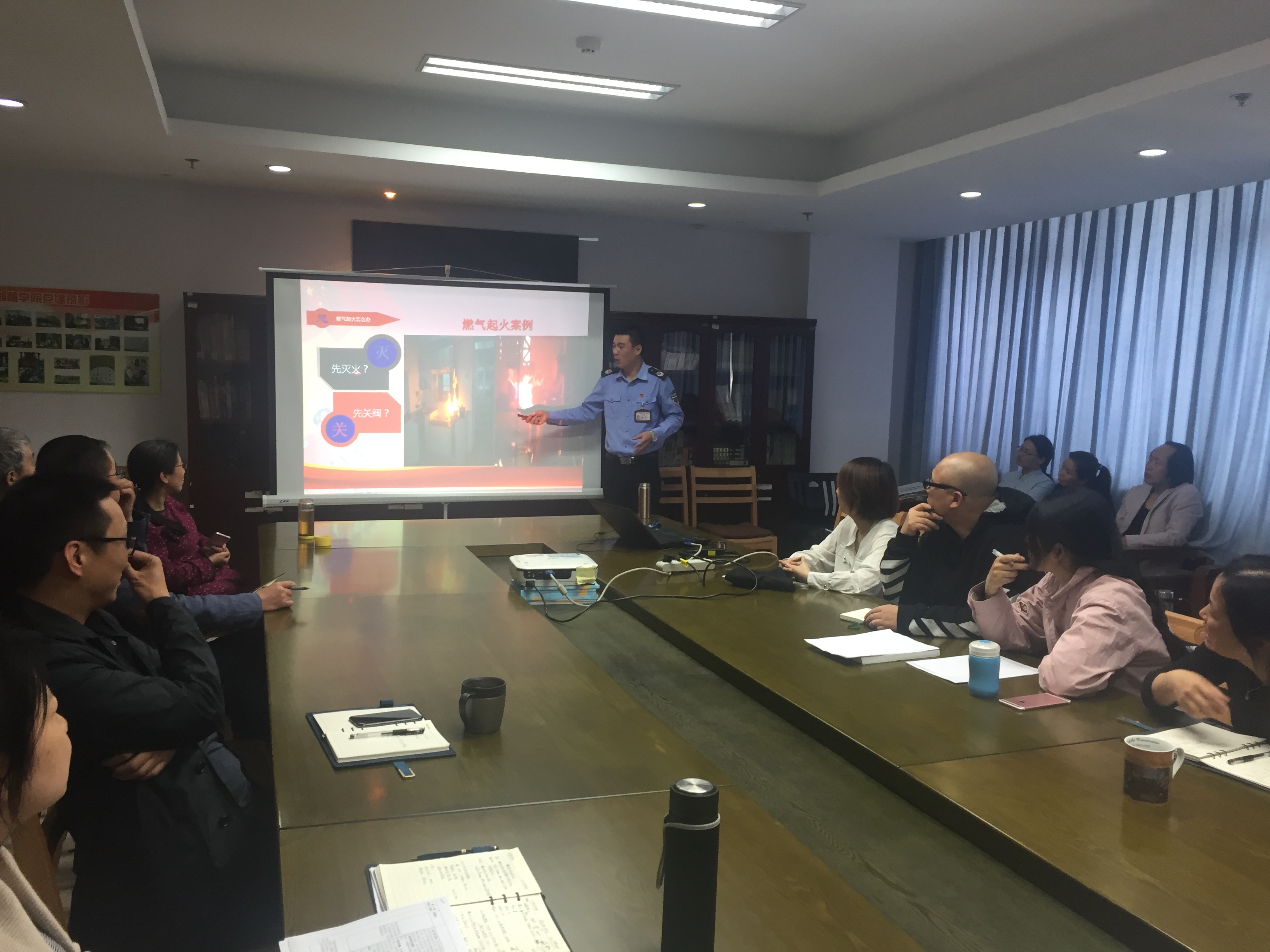 2018年4月25日下午文创学院召开全体教工大会开展消防讲座培训,此次培训请来了江苏安居安防的消防宣传教官高正为大家讲解了公共场所和家庭消防的注意事项和要点。高教官通过再现每一个火场的现场生动地为大家讲解具体解决办法。通过讲座大家树立正确防火安全意识,学习到很多安全的解困正确处理方法,为学院的人员财物消防安全提供了思想上保障。