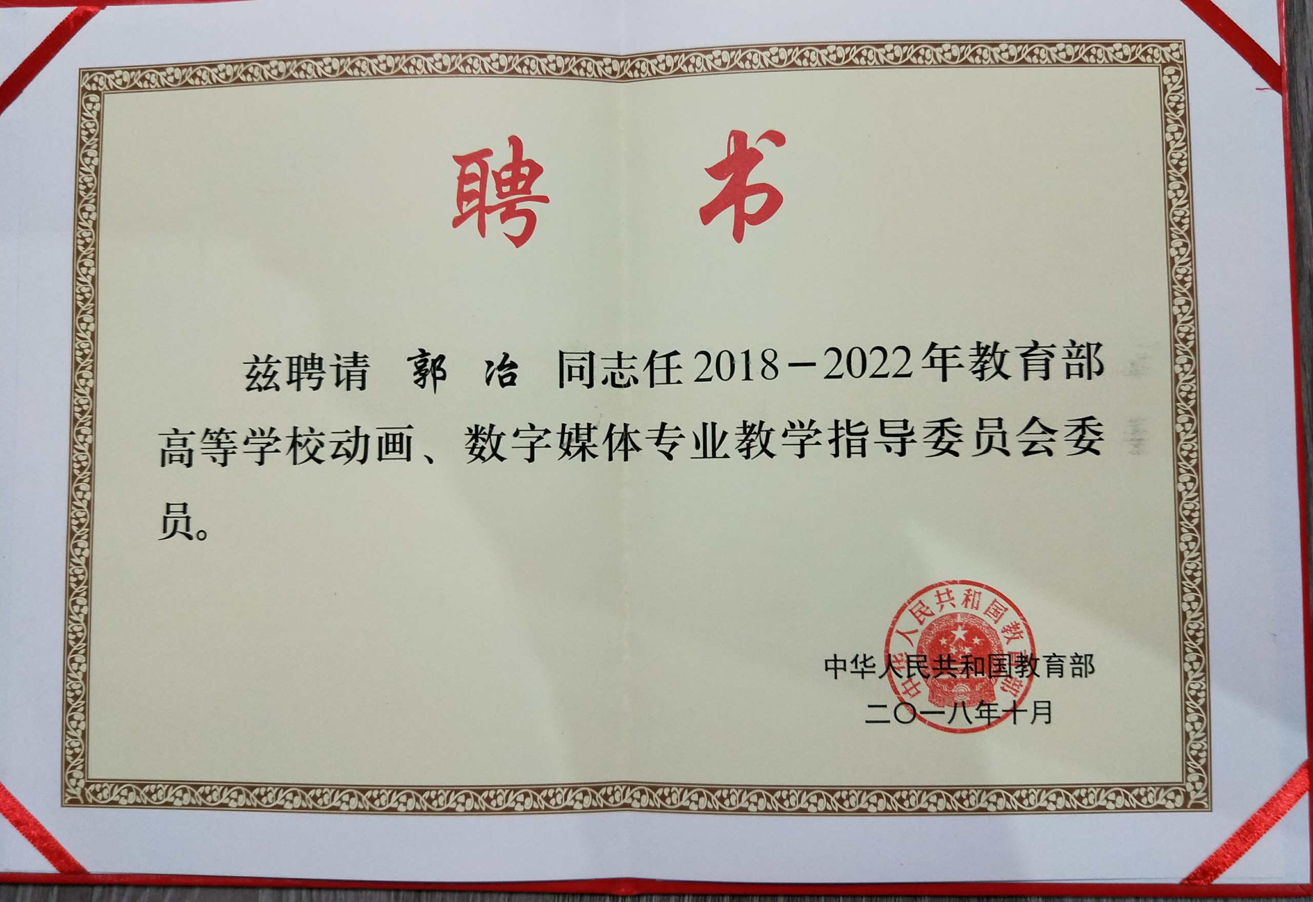 恭贺文创学院郭冶教授获得2018-2022年教育部高等学校动画、数字媒体专业教学指导委员会委员