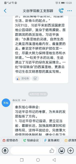 4月22日下午,文创学院教工党支部在钉钉群举行了线上学习习近平在浙考察讲话精神的主题党日活动。