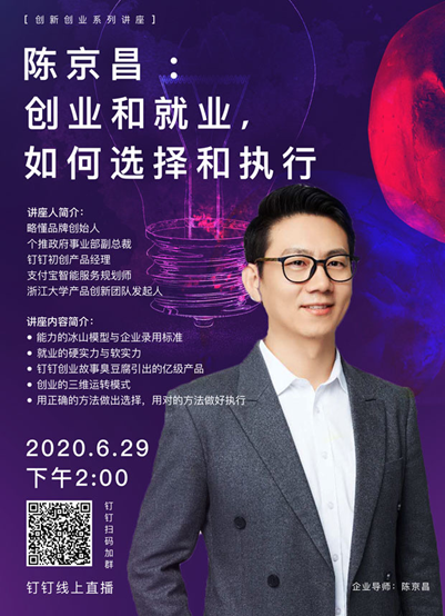 关于未来如何选择-就业or创业的不同游戏规则,能力的冰山模型与企业录用标准;就业的硬实力与软实力;钉钉创业故事-臭豆腐引出的亿级产品;创业的三维运转模式;用正确的方法做出选择,用对的方法做好执行。