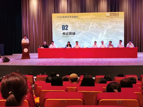 2020级新生开学典礼于恕园7号楼五百座隆重举行。院党总支书记范小春、副院长杨欢耸、副院长郭持华、党总支副书记周微微、高端人才夏烈、专业负责人郭冶、教研室主任、行政科室负责人、新生班主任和辅导员出席本次典礼。