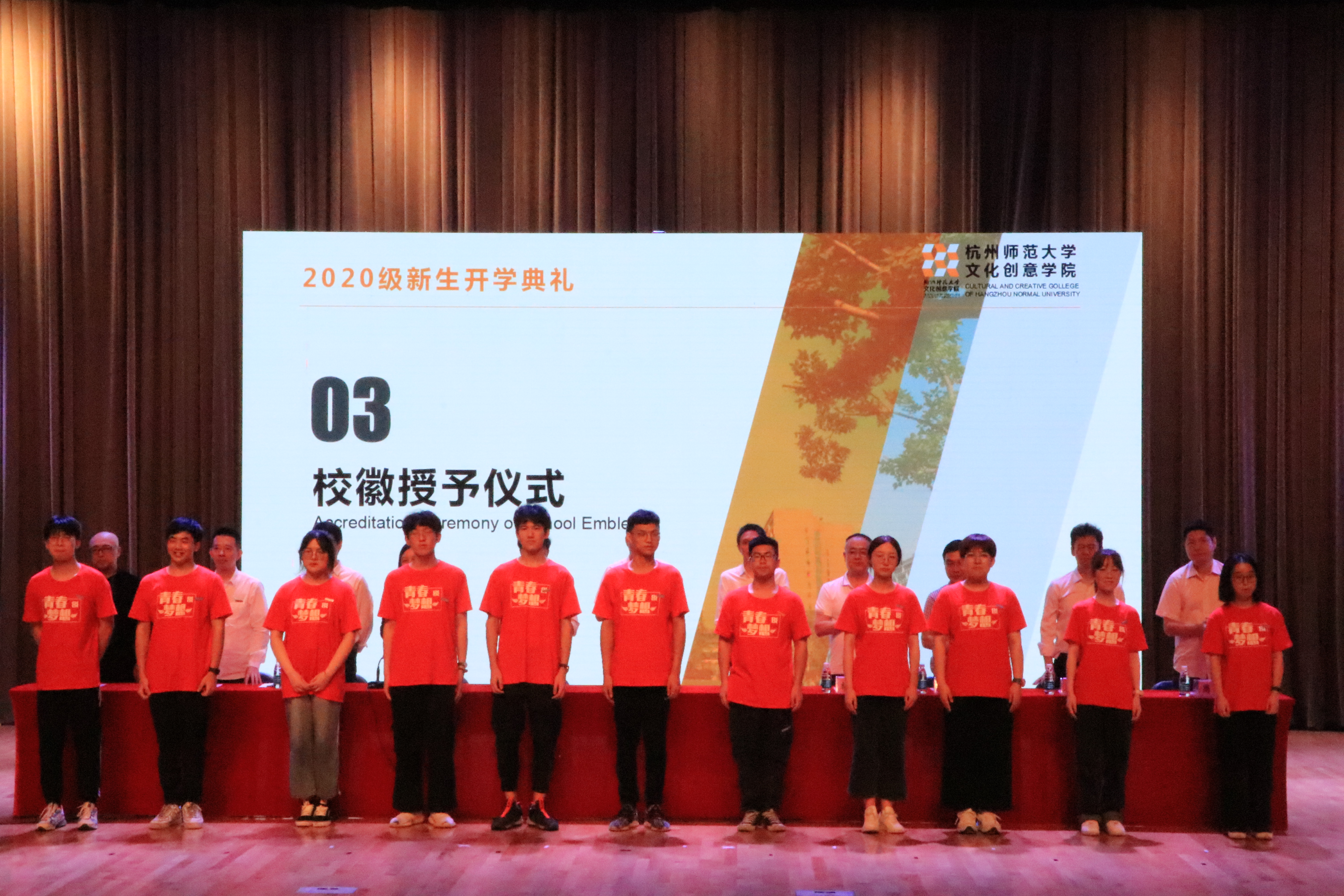 紧接着,进入校徽授予环节,台上领导和嘉宾为新生代表们佩戴校徽。小小的校徽,承载着杭师大学子的希望和梦想,凝聚着所有杭师大人的关心和爱护。