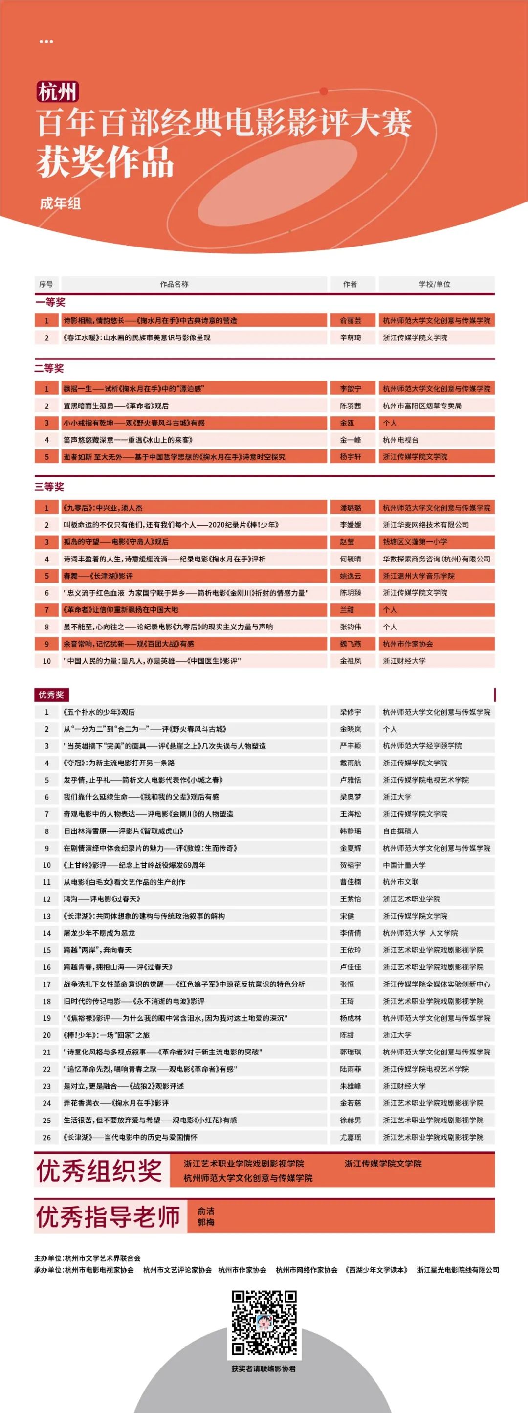 据悉,此次大赛征集工作历时4个月,共征集到全国各地的影评作品486篇,其中成年组共评出一等奖2项、二等奖5项、三等奖10项。