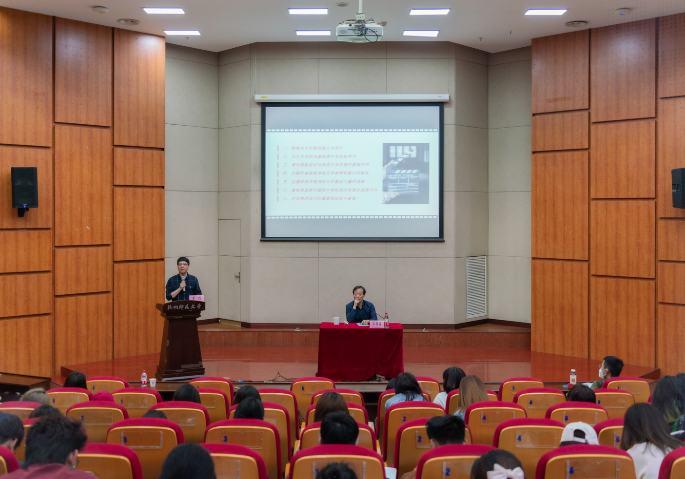 王国富老师表示,影视艺术是综合艺术,影视创作是一项系统工程,需具备文学性的逻辑框架和布局。王国富老师结合自身创作经历,从影视创作的各个方面,包括文学作品,创意,策划,改编,拍摄制作,播映,评奖等向同学们做了简要分享。他指出,文学是艺术的基础,文学创作是影视创作的头道工序。其次,策划是影视创作具有文学灵感的基础环节,剧本编写与改编是项巨大工程,是考验文学修养和耐心的根本,而拍摄和制作依靠组织化的集体力量。最后,王国富强调,评奖是对创作的重要肯定但不是评价一个作品的唯一标准,鼓励大家保持创作初心。