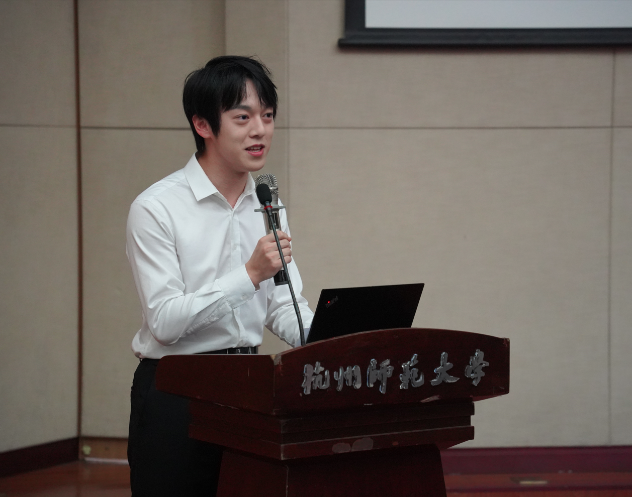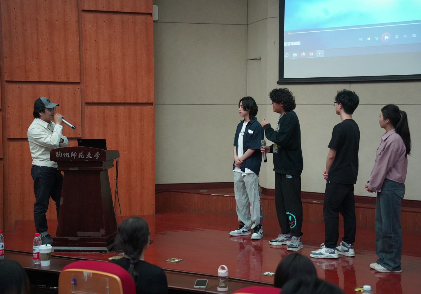 此次活动由一堂生动的公开课开始,皇贞季老师从国内译制片《普通一兵》、《虎口脱险》等经典配音电影引出“生活的艺术:让配音更有‘戏路’”这个话题,给在场的同学们详细讲解了配音艺术的难点不仅在于如何翻译的恰到好处,更需要与画面贴合、口型一致。讲座中,皇老师与同学们分享了其在创作过程中的一些趣事,当谈到对配音这门艺术的初心与坚持时,皇老师表示“热爱”是从事配音的开始也是他一路坚持的原因。