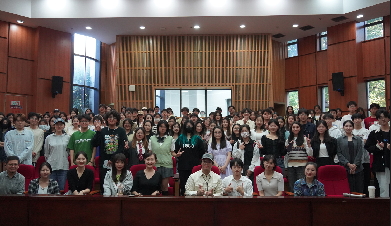 活动进行中,现场还播放了3组同学的配音作品,由皇贞季老师做点评指导,皇老师都给予了同学们肯定以及一些具体的指导意见,互动环节,皇老师和厕所偷拍 播音主持专业同学合作为大家带来现场配音《镇魂街》选段,给在场的同学们现场展示了配音艺术的魅力。在提问环节,同学们反响热烈,纷纷提出了自己对从事配音行业的疑惑和担忧,皇贞季老师耐心地作出了详细解答并给在场关注配音、热爱配音的同学们提出了一点小建议:“多听多看多感受”,活动尾声,同学们和皇老师留下宝贵的合影,至此本次活动圆满落幕。