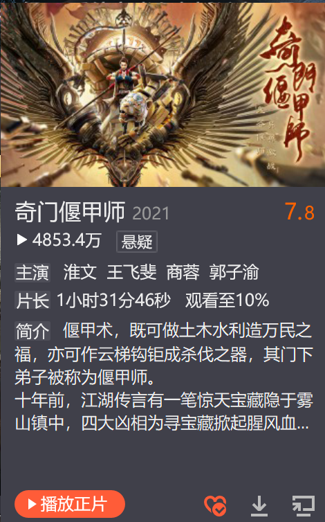 由刘守闯学长编剧的《奇门偃甲师》电影于2021年5月7日在腾讯视频独家播放,该片悬念十足,人物鲜明,向同学们鼎力推荐!