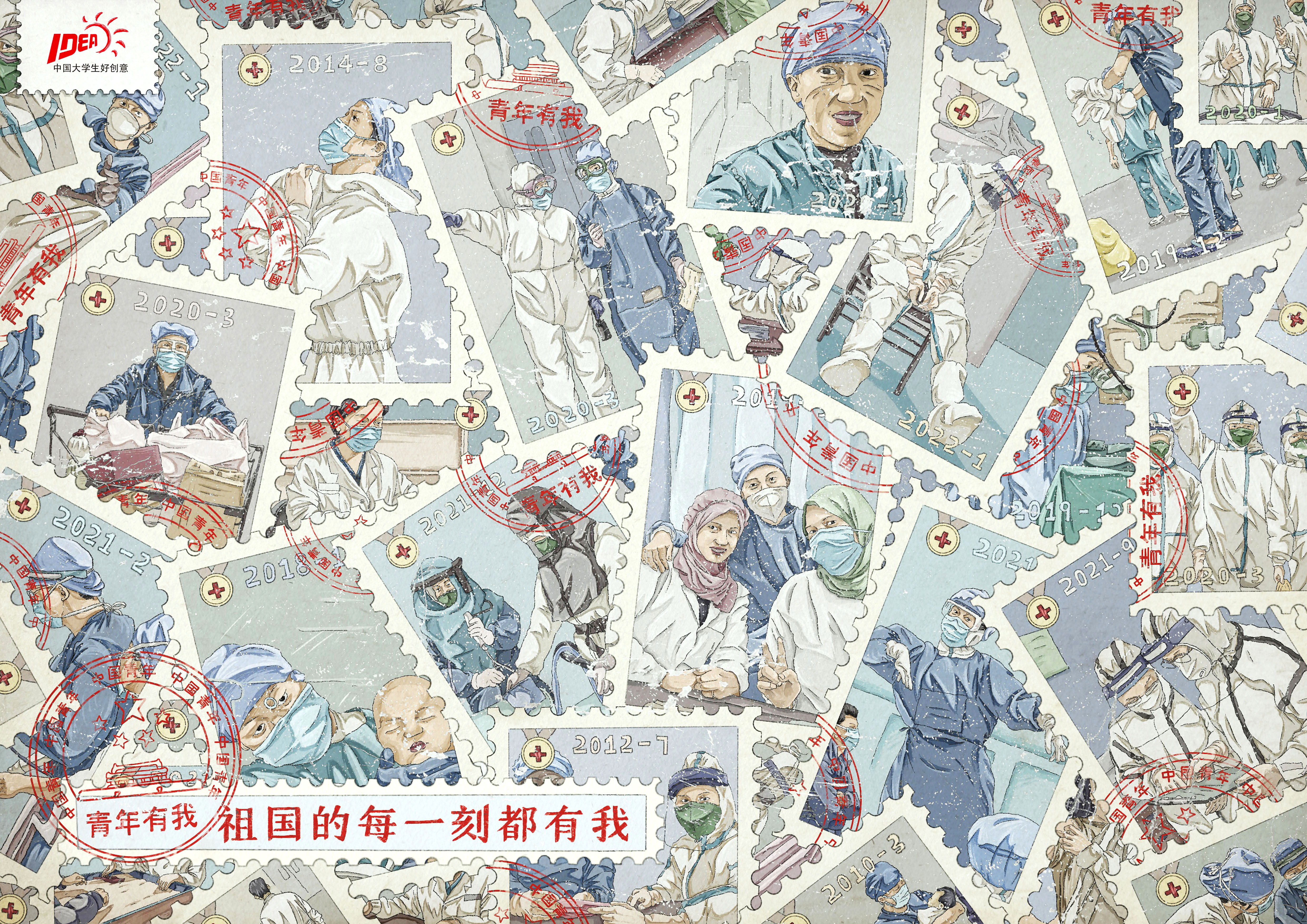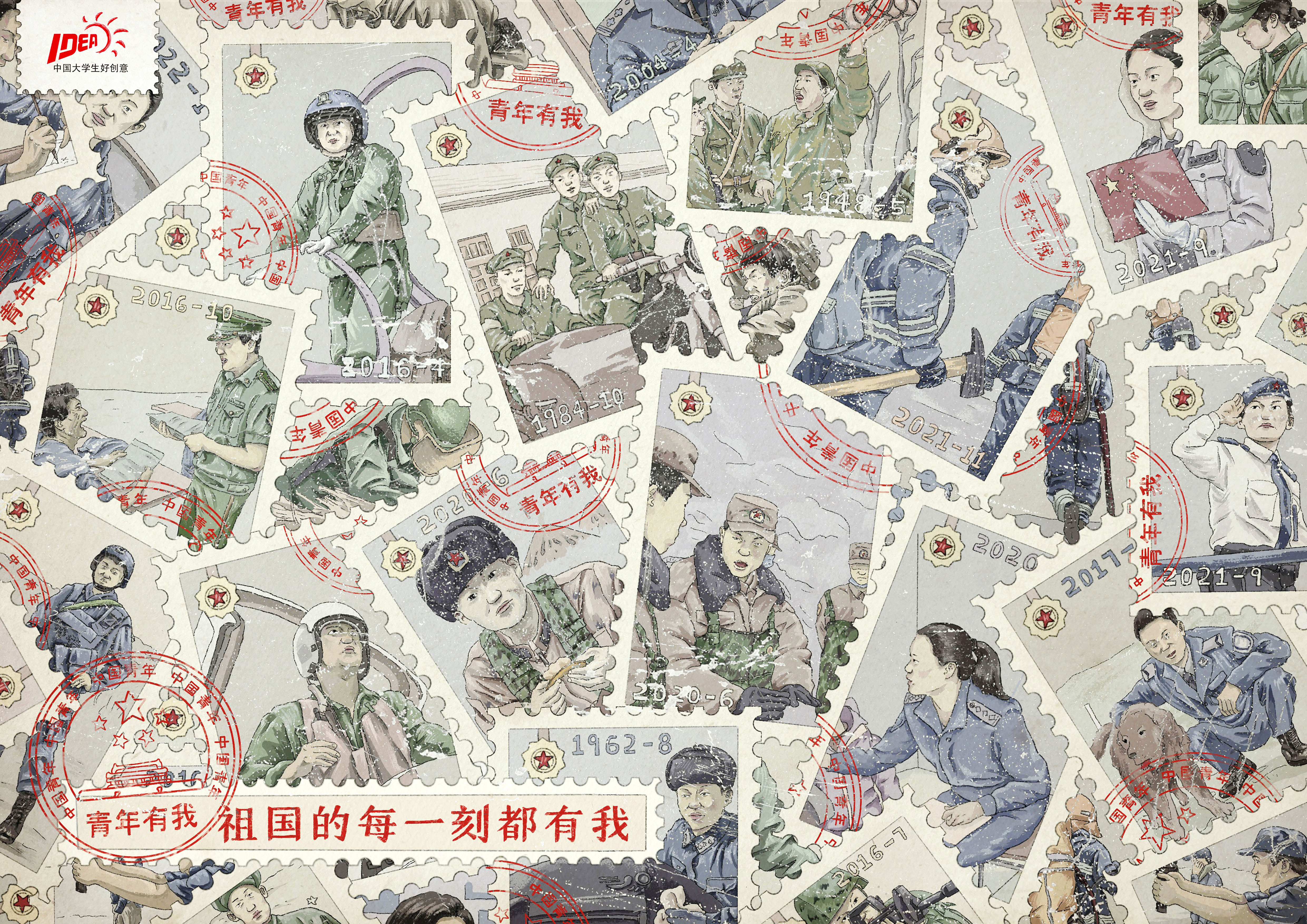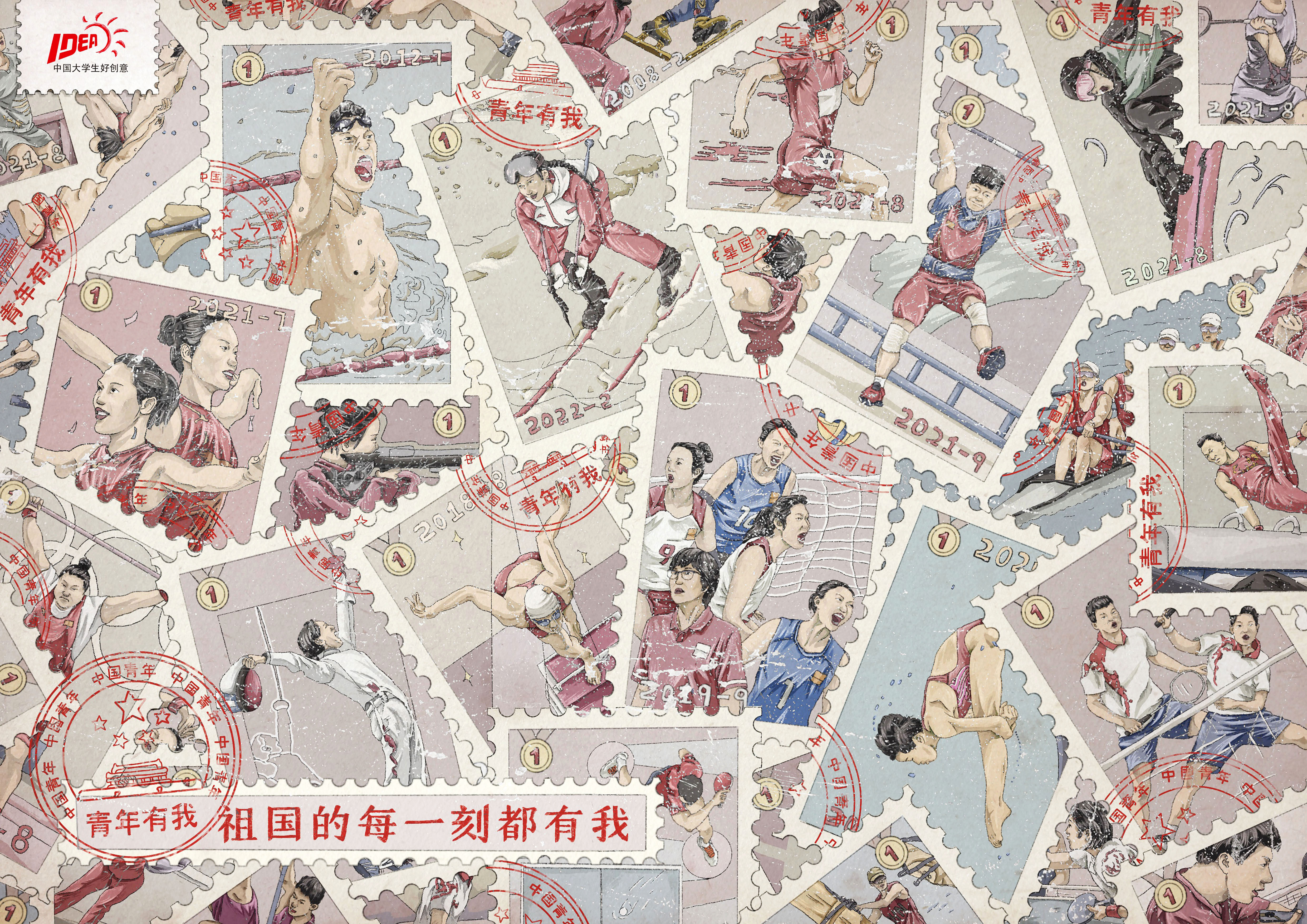 青年的理想信念关乎国家未来。青年的远大理想、坚定的信念是一个国家、一个民族无坚不摧的前进动力。深入贯彻习近平新时代中国特色社会主义思想的《新时代的中国青年》白皮书的时代背景下。作品从奋斗青年的不同角度进行描绘:青年士兵、青年运动员和青年医生,以点带面,唱响“青年有我,祖国的每一刻都有我”的青春主旋律。展现一大批有志青年挑千斤重担,乘风浪前行,担时代之责,展青春荣光。作品采用插画写实的手法表现真实感,以邮票为媒介载体传达寄托与传递的概念,让青春铸就梦想,传递每一时代的青春模样!