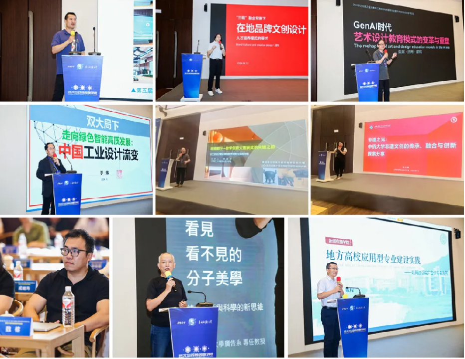 湖州职业技术学院艺术与时尚创意学院院长谭悦,中国美术学院上海设计学院原常务副院长、教授、博导范凯熹,华东理工大学艺术设计与传媒学院科研院长、教授、博导于炜,江西理工大学建筑与设计学院教授、硕导黄金发,上海中侨职业技术大学艺术学院书记兼副院长戴红梅,台湾中国文化大学广告系专任教授杨胜雄,闽江学院新闻传播学院副院长、博士、教授戴程,福建理工大学硕导、教授周华清,湖州师范学院艺术学院硕导、副教授王娜,浙江同济科技职院副教授、教育部职业院校艺术设计教指委分委会委员范子珍,我院章瑞智、魏榕副教授等12位专家,分别从文创设计人才培养、AI时代的艺术设计教育、绿色智能工业设计发展、教师赛备赛经验分享、非遗文创传承与创新、分子美学新思维、地方高校专业建设实践、广告教育的产教融合探索、活版印刷的创新传承以及AI在影视广告中的应用、新媒体艺术跨界融合等方面,分享了他们的宝贵经验和独到见解。