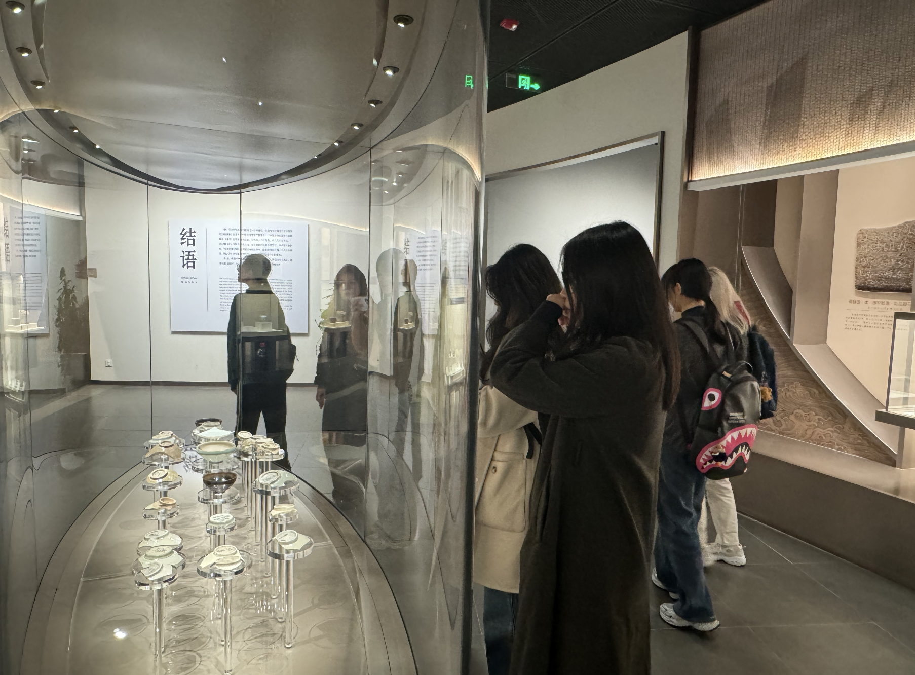 为传承中华优秀传统文化,进一步提振党员文化自信,下午2时支部全体成员赴南宋德寿宫遗址博物馆开展党日活动。在党委组织员陆丽青和党支部书记林佳亮的带领下,大家首先参观了位于中区一层的南宋德寿宫遗址博物馆。展览共分“背海立国”、“盛世繁华”两个版块。展出了书画、瓷器、玉器等艺术珍品,展现了南宋高超的工艺水平与社会风采。博物馆的核心区域之一是地下一层的重华宫正殿遗址,透过玻璃栈道,可以近距离观察到香糕砖、磉墩、柱础石等南宋遗存,感受历史的沧桑变迁,公益影片的播放让党员们深刻领悟到中华传统文化的深厚内涵,南宋德寿宫遗址博物馆作为历史的见证,彰显了南宋时期的辉煌文化和深厚底蕴。支部预备党员、2022级本科生何涛表示,“通过此行深刻地感受到了南宋时期的文化繁荣与社会进步,深切领略了宋韵文化的独特魅力,对历史有了更加直观和生动的理解。优秀传统文化不仅是历史的宝贵遗产,也是推动当代社会发展的精神动力,我们要好好继承,更好努力发扬!”