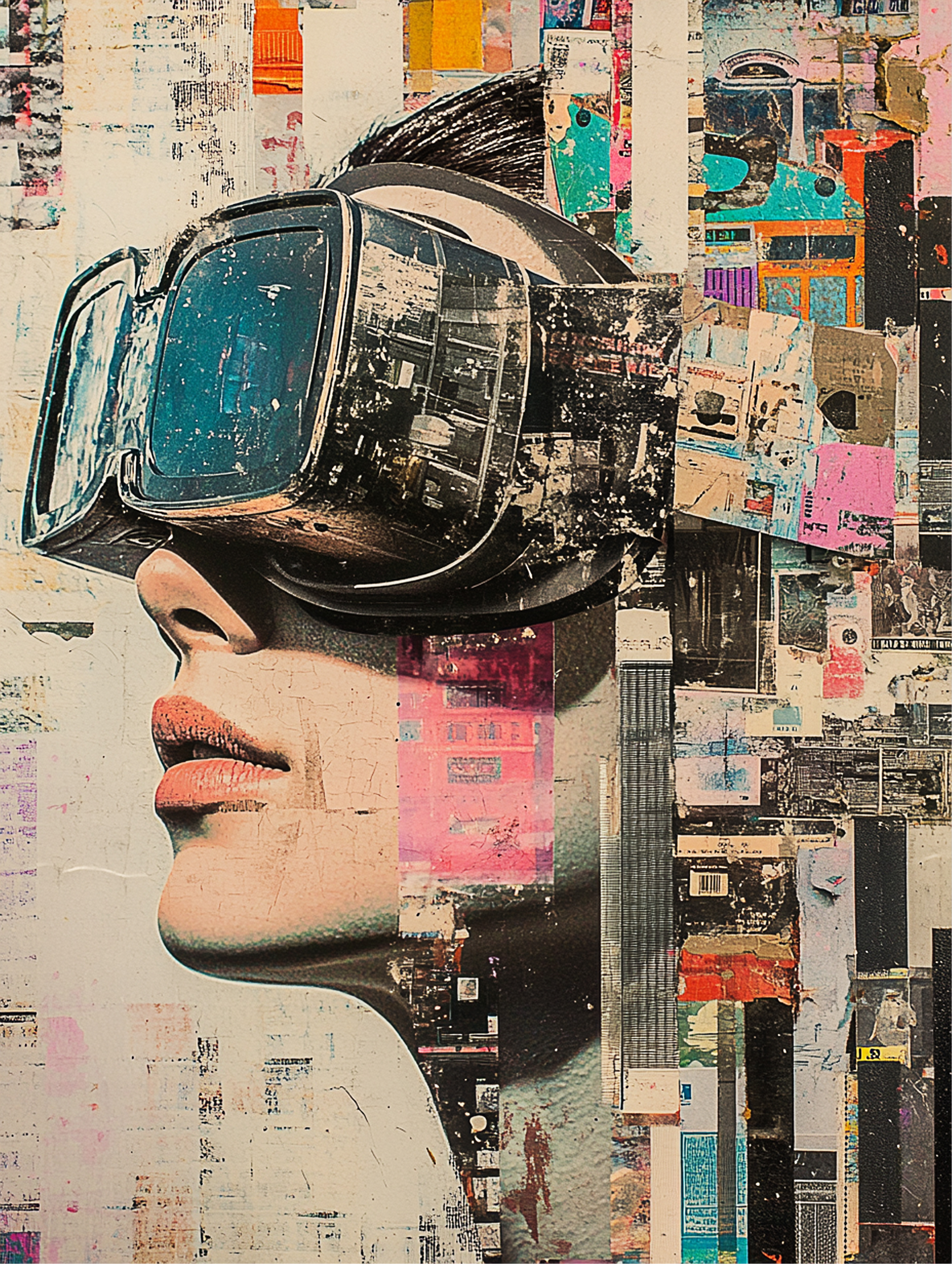 这系列作品以一位佩戴VR眼镜的女性形象为核心元素,巧妙地融合了科技与艺术的界限。女性侧脸轮廓清晰,仿佛正沉浸在一个虚拟与现实交织的世界中。她的眼神专注而深邃,似乎在探索未知的领域。背景由各种抽象图案构成,色彩斑斓且富有层次感。这些图案既像是数字代码,又像是宇宙星辰,给人一种无限延伸的感觉。它们环绕着女性的头部,形成一种光环效果,强调了她在这一场景中的中心地位。整体而言,这幅作品传达了一种对未来科技的憧憬和对未知世界的好奇心。它鼓励观者思考现实与虚拟之间的关系,以及人类在不断进步的技术面前所扮演的角色。同时,作品的视觉效果也十分震撼,令人过目难忘。