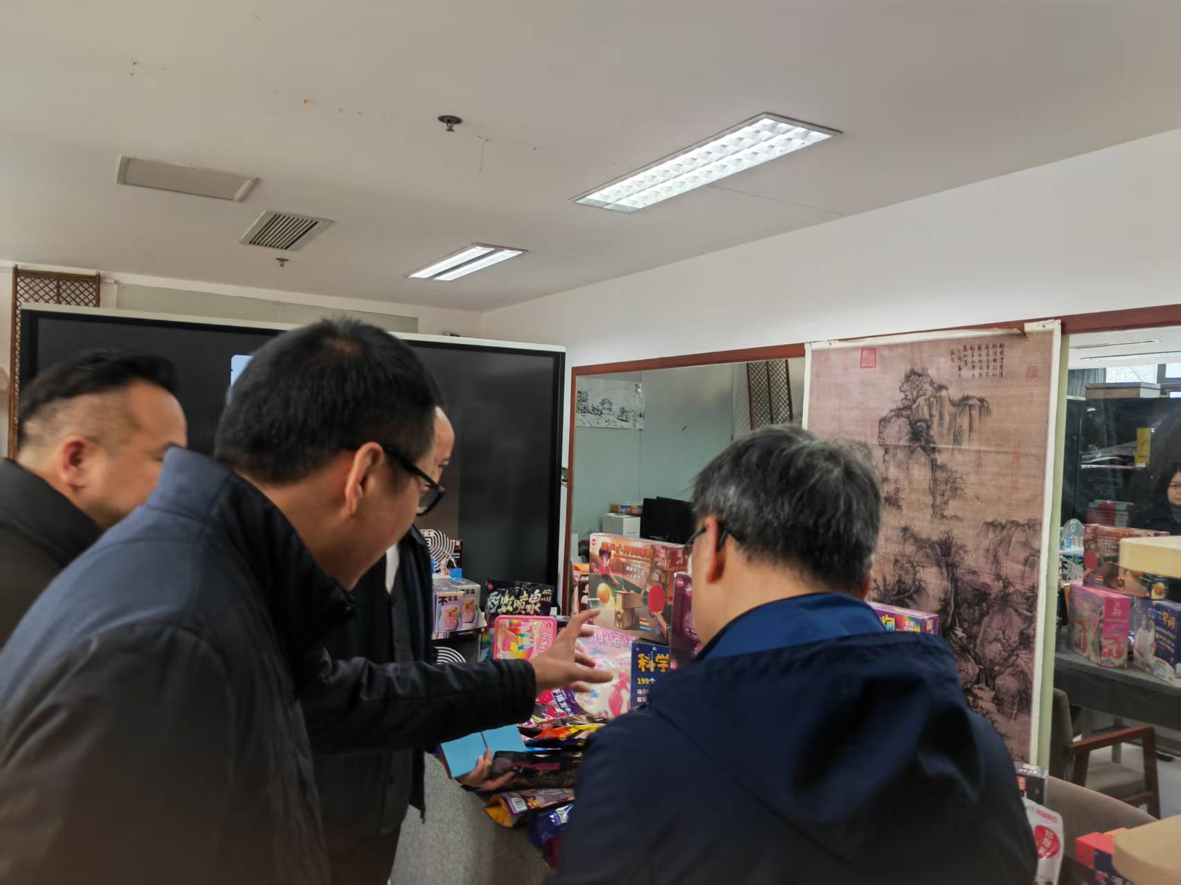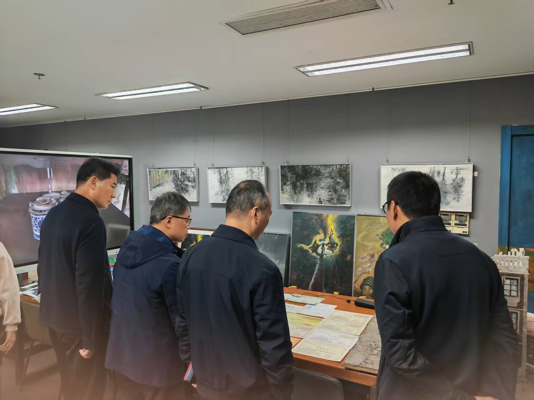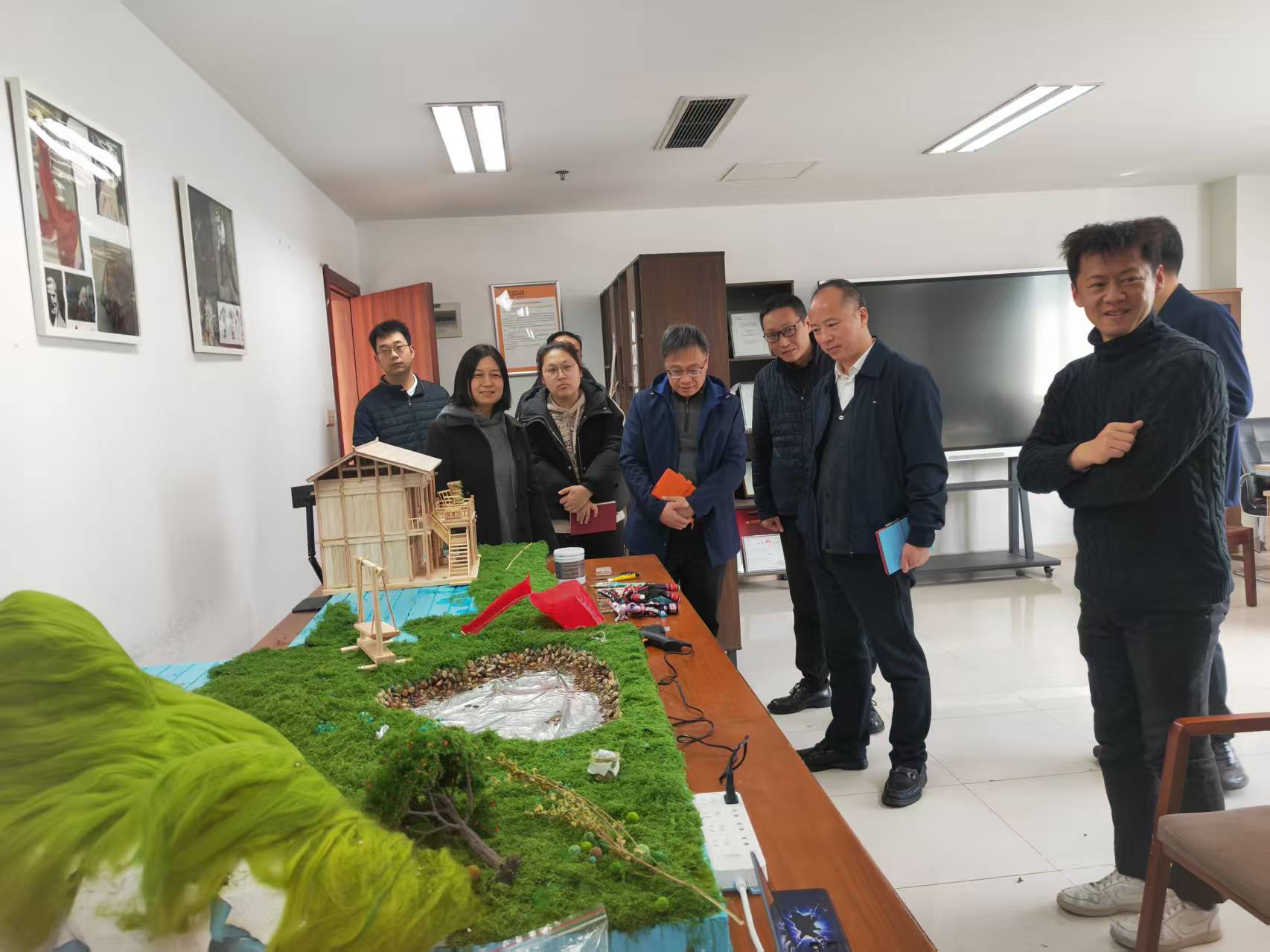 丁向崧一行首先参观了学院研创中心呈现的动画设计类、文创设计类、动漫设计类、产品设计类、影视短视频类与公益广告相关的作品。随后院长范小春介绍了学院目前发展建设与师资现状情况。杭州市文明办副主任丁向崧从成立创作联盟单位,以及如何从公益广告传播学术上理论研究提供支持,结合师生创作成立合作基地,让高校的公益广告研究和创作通过合作去市场检验几个方面提出合作的想法和思路。华数集团党委委员王明华从杭州文创之都和人工智能背景下结合公益特色如何合作创作各类公益广告作品,如何推送宣发渠道,提出具体想法。